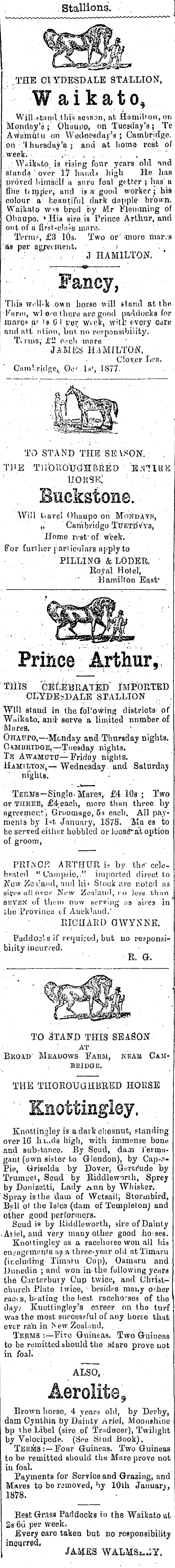 Stallions. . j . THE 01 YDESD ALE STALLION, Waikato, Will. etand this season, at Hamilton, on Mqndny's ; Oiiiiupd, on Tuesday's ; Tc Avvolnut'u on Wednesday's ; Cambridge. on 'Ihuradav's ; : and at home ; rest o/ : week. •».,:, v ' : Wuikato, is rising four years old slan'da ' over 1.7 hfuicb high He has proved himself a suro foal getter ; has' a fine liinp'er,' and is a' good worker; hia colour a neauiiifiil dark dnpple brown. . Waikalo w«s bred by iVIr Vlemming of Ohaupo. « His sire, is Prince Arthur, and out of a firVl»clii?s mare. ■'iVi'm?', £3 10s. Two or' -more riiar.s 'as per agreement* - > . .; . t . J HAMILTON. ' __ . — c — , Fancy, Tliis w.'ll-k own horse will gtnnd at the Knrrn, wl c ■el here are good pad docks for marc* a 1 i b .0 I per wick, .wilt. every curt; and att ntion, but no responsibility. Ti mis,' £2 c.ich more JAMES HAMILTON, -:.. Clover Lea. Gamlridge,, Oo' ls f , 1877. TO STAND THE SEVSON. . THE TirbiVOtJGtHBRED B.3TIUK uorse!' : ■ Buekstone.-' 'Will liavel OhaupO on MottdAts, „' ' Cambridgo TUETiSv'YS, Homo rest' of week. For further particulars tipply to . PILLING & LODER. Royal Hotel, • ' tlamiUon East' Prince 4^ ur » TlliS .CELEBRATED' IMPORTED I'"'"'. CLYDEiDALE STALLION . ; Will staud m the following districts of Waikato, and' serve a limited number, of, Mures. ' ' ' " OnAirro, — Monday and- Thursday nights. I Cambridge.— Tuesday nights. Te AWAMtJTU— Friday nights. Hamilton-,— Wednesday, and Saturday nights. ■Terms— Single- Maves, £4 10s ; Two or THREE, £4 each, more than three by agreemcr.r I Groomage, ?m each. All payments by l«fc Janunry, IS7B. Ma es to be served either hobbled or ioose^at option of groom, PRTaOE ARTHUR is by tfc.tr celebrated " Cainpjio, ," imported direct to j Now Zorand, nnd hi< Stouk are noted us sivps Jill over 1 New Zealand, ro less than SKVEN of tlivii) now serving ;ia sires in ' | iho Provinco c-f Auckland. 1 j.' ' ' KICHAR-D GWYNNE. Paddoa'-s if required, hut no reaponsibiiity incurred. r. a. to Stand this season ; : AT Broad' Meadows Farm, krab Cam- . bbid&e. THE THOROUaHBRED HOUSE Enottinaley i3 a dark chosnut, standing over 16 hi.*ds high, with immense bone and substance. By Scud, daaa Termttgant (own sister to G-lendon), by Cap-?-Pie, Griselda by Dover, Gerti'nde by Trumpet, Scud by Riddleworih, Sprey by Donizetti, Lady Aim by Whisker. Spray is the daua of Wctsail; Stormbird, Bell of the Isles (dam of Templetonj and other Rood performers. Scud is by Riddleworth, sire of Dainty • Ariel, and very many other good hoises. Knoitingley as a racehorse wou all hia eni-ngcmßnts aa a three-year old at Timaru (including Timaru Cup), Oamaru and Duucdin ; and won m- the following years the C:iKtcrbury Cup twice, and Chriitchurch Plato twice, besides mauy o?her raci s, bvating the best racehorses of the day.- Kuottingley's career on the turf was the most successful of any horee that ever ran m New Zcalmd. . Terms : — Five Guineas. Two Guineas to be remitted bhould the Mare prove uot m foal. ALSO, Aerolite 9 Brown horse, 4 years old, by Derby, darn Cynthia by Dainty Ariel, Moonshine bp the Libel (sire of Tradncer), Twilight by Velocipede. (Spe Stud Book). TEBM3:— Four Guineas. Two Guineas to be remitted should the Mare prove not m foal. Payments for Service and Grazing, and Mares to be rsmoved, by 10th January, 1878. Best Grass Paddocks m the Waikato at 2s 6ii per week. Every care taken but no responsibility incurred. JAMES WAL.M&L.-Y.