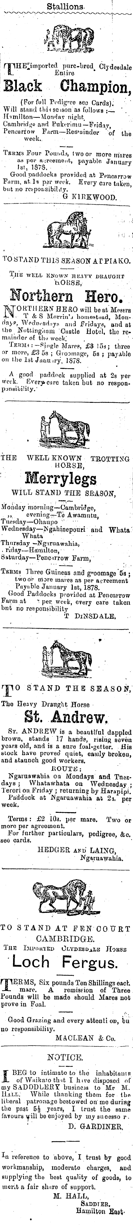 Stallions- . \ i ■'■■.■ i TH Exported pure-bred^ Clydesdale Entire Black Champion, (Por full Pedigree sco Cards). ; Will stand Mih sei&on aa follows ;— ' . If»mHton— Monday night, Cambrid^o and Pukerimu— Friday, Penearfow Farm— Remainder- of the week., Tbrms Four Pounds, two or more mares as per aircemenfc, payable January Ist, 187 S. G-ood paddocks provided at Pencßrrow Farm, at Is par week. Every care taken, but no responsibility. G KIRKWOOD. TO STAND THIS SEASON Ar PIAKO. 1,1112 WELL KNOWN HBATT DUAUCrIIT h.ORSE!, Hortliera Hero. NORTHERN' HERO will be at' Messrs . . . T&S Morrin'j homestead, Mon-da>P,'W<>dD.i-sd:»y s and JFridaya, and at i.ho Noti,ingrtqm Cuatle Hotel, the remainder at th«; week; . . Term* : —Single Mares, '£3 15s ; three or more, £3 5s ; Groamnge, 6s ; payable on tlie Ist JiKiuiry, IS7S. A good paddock supplied at 2a per week. Every. care taken but no responpjnsibility.' THE WELL KNOWN TROTTING , HORSE, Merrylegs WILL STAND THE SEASON, Monday morning— Cambridge, „ eveningTT-Te Awamutu, Tuesday — Ohaupo ' ' Wednesday— N gahinepouri and Whata.' Whata Thursday -Ngaruawaliia, - .riday — Hamilton, - Saturday— Pencirrow Farm, Tbbm3 Three Guineas and g"oomage 5a • two or more mines as per aereement ■Payable January Ist, 1878. Good Paddocks provided at Pehoarrow Farm at -. per, week, every care taken bnt no responsibility T DiNSDALE. ■ rj\O STAND THE SEASON, The Heavy Dranght Horse St. Andrew, St. ANDREW is a beautiful dappled brown, Btahds "17 hands, rising seven yoars old, and is a sure foal-getter. fliß Btook have proved quiet, easily brokeu, and staunch good workers. liOUTB: Ngaruawabia oa Mondays and Tneßdays j Whata whata on Wednesday ; Terori ou. Friday j returning by Harapipi. Paddock at JMgaruawahia aS 23, per week. Terms : £2 10a. pat mare. Two or more per agreement;. For further particulars, pedigree, &c. see cards. HEDGER and LAING, NgaruaYrahia. TO STAND AT FEN COURT CAMBRIDGE. The Lvn'oitiEi* Olydesd^le Hobsb Loch Fergus. mERMS, Six pounds Ten Shillings each JL mare. A remission of Three Pounds will be made should Mares not prove m Foal. Good Grazing and every abtenti on, bu no responsibility. MACLEAN & Co. NOTICE. , 1 BEG to intimate to the inhabitants of Waikato that I h ive disposed of my SADDDLERY busineas to Mr M. Hall. While thanking them for th* liberal patronage bestowed on' me during the post 5i years, I trust the same favours will be enjoyed by my sneesso r. D. GARDINER. ■*-n reference to above, I trust by good workmanship, moderate charges, and supplying the best quality of goods, to ment a fair Bhiire of support. M. HALL, Saddter, I HamiUpn E&stj.