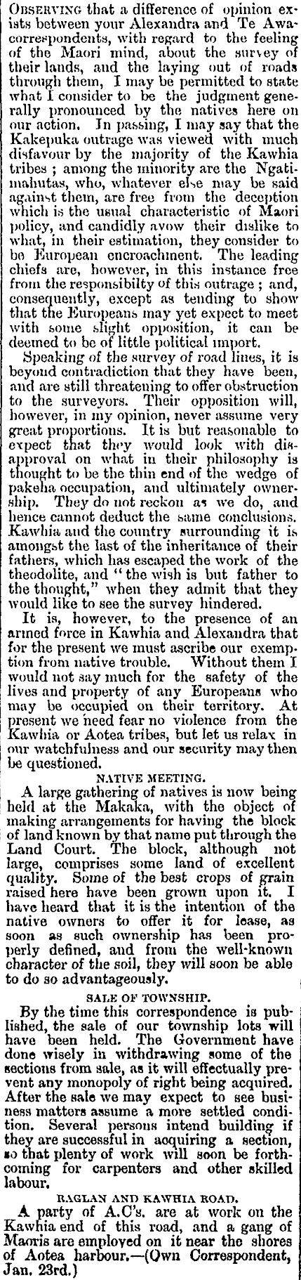 Observing that a difference of opinion exists between your Alexandra and Te Awacorreppondents, with regard to the feeling of the Maori mind, about the survey of their lands, and the laying out of roads through them, I may be permitted to state what I consider to be the judgment generally pronounced by the natives here on our action. In passing, I may say that the Kakepuka outrage was viewed with much disfavour by the majority of the Kawhia tribes ; among the minority are the Ngatimahutas, who, whatever else may be said against them, are free from the deception which is the usual characteristic of Maori policy, and candidly avow their dislike to what, in their estimation, they consider to bo European encroachment. The leading chiefs are, however, in this instance free from the responsibilty of this outrage ; and, consequently, except as tending to show that the Europeans may yet expect to meet with some .slight opposition, it can be deemed to be of little political import. Speaking of the survey of road lines, it is beyond contradiction that they have been, and are utill threatening to offer obstruction to the surveyors. Their opposition will, however, in my opinion, never assume very great proportions. It is but reasonable to expect that they would look with disapproval on what in their philosophy is thought to be the thin end of the wedge of pakeha occupation, and ultimately ownership. They do not reckon as we do, and hence cannot deduct the same conclusions. Kawhia and the country surrounding it is amongst the last of the inheritance of their fathers, which has escaped the work of the theodolite, and "the wish is but father to the thought," when they admit that they would like to see the survey hindered. It is, however, to the presence of an armed force in Kawhia and Alexandra that for the present we must ascribe our exemption from native trouble. Without them I would not say much for the safety of the lives and property of any Europeans who may be occupied on their territory. At present we need fear no violence from the Kawhia or Aotea tribes, but let us relax in our watchfulness and our security may then be questioned. NATIVE MEETING. A large gathering of natives is now being held at the Makaka, with the object of making arrangements for having the block of land known by that name put through the Land Court. The block, although not large, comprises some land of excellent quality. Some of the best crops of grain raised here have been grown upon it. I have heard that it is the intention of the native owners to offer it for lease, aa soon as such ownership has been properly defined, and from the well-known character of the soil, they will soon be able to do so advantageously. SALE OF TOWNSHIP. By the time this correspondence is published, the sale of our township lots will have been held. The Government have done wisely in withdrawing some of the sections from sale, as it will effectually prevent any monopoly of right being acquired. After the sale we may expect to see business matters assume a more settled condition. Several persons intend building if they are successful in acquiring a section, •o that plenty of work will soon be forthcoming for carpenters and other skilled labour. RAGLAN AND KAWHIA ROAD. A party of A.C's. are at work on the Kawhia end of this road, and a gang of Maoris are employed on it near the shores of Aotea harbour. — (Own Correspondent, Jan. 23rd.)