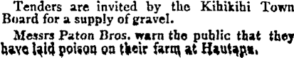 Tenders are invited by the Kihikihi Town Board for a supply of gravel. Messrs Puton Bros, warn the public that they h*vc laid, poison on tfwir f»rn\ %t U^ut^pt,