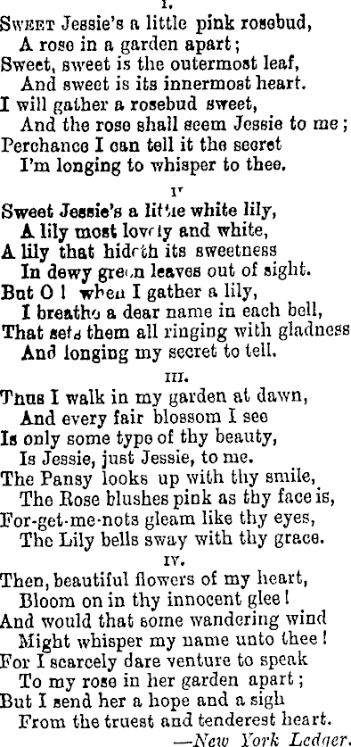 I, Sweet Jessie's a little pink rosebud, A rose in a garden apart; Sweet, sweet is the outermost leaf, And sweet is its innermost heart. I will gather a rosebud sweet, And the rose shall seem Jessie to me; Perchance I can tell it the secret I'm longing to whisper to thee. i t Sweet Jessie's a KCie white lily, A. lily most lovrly and white, A lily that hidrth its sweetness In dewy gre<,n leaves out of sight. Bnt 0 ! wbea I gather a lily, I bre&tho a dear name in each boll, That setd them all ringing with gladness, And longing my secret to tell. in. Tnua I walk in my garden at dawn, And every fair blossom I see Is only some typo of thy beauty, Is Jessie, just Jessie, to me. The Pansy looks up with thy smile, The Eose blushes pink as thy face is, For-get-me-not3 gleam like thy eyes, The Lily bells sway with thy grace. IV. Then, beautiful flowers of my heart, Bloom on in thy innocent glee I And would that some wandering wind Might whisper my name unto thee 1 For I scarcely dare venture to speak To my rose in her garden apart; But I send her a hope and a sigh From the truest and tenderest heart. —New York Ledger.