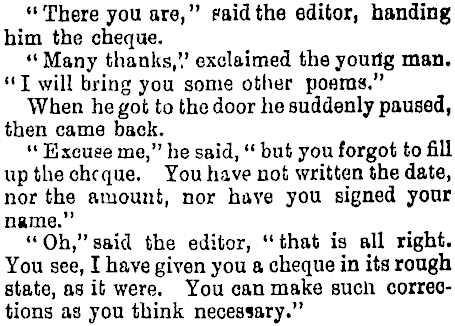 11 There you are, " paid the editor, handing him the cheque. " Many thanks,', 1 exclaimed the yourfg man. " I will bring you some other poems." When he got to the door he suddenly paused, then came back. " Excuse me," he said, " but you forgot to fill up the cheque. You have not written the date, nor the amount, nor have you signed your name." "Oh," said the editor, "that is all right. You see, I have given you a cheque in its rough state, as ib were. You can make sucn corrections as you think necessary."