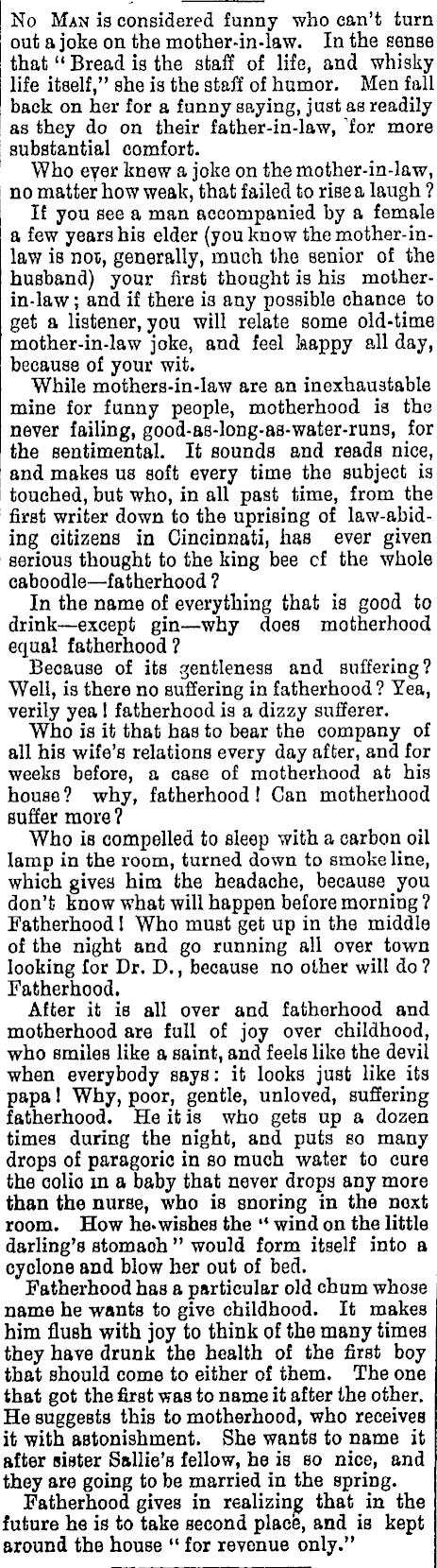 No Man is considered funny who can't turn out a joke on the mother-in-law. In the sense that " Bread is the staff of life, and whisky life itself," she is the staff of humor. Men fall back on her for a funny saying, just as readily as they do on their father-in-law, 'for more substantial comfort. Who ever knew a joke on the mother-in-law, no matter how weak, that failed to rise a laugh ? If you see a man accompanied by a female a few years his elder (you know the mother-in-law is not, generally, much the senior of the hußband) your first thought is his mother-in-law ; and if there is any possible chance to get a listener, you will relate some old-time mother-in-law joke, and feel kappy all day, because of your wit. While mothers-in-law are an inexhaustable mine for funny people, motherhood is the never failing, good-as-long-as-water-runs, for the sentimental. It sounds and reads nice, and makes us soft every time the subject is touched, but who, in all past time, from the firßt writer down to the uprising of law-abid-ing citizens in Cincinnati, has ever given serious thought to the king bee cf the whole caboodle—fatherhood ? In the name of everything that is good to drink —except gin —why does motherhood equal fatherhood? Because of its gentleness and suffering? Well, is there no suffering in fatherhood ? Tea, verily yea 1 fatherhood is a dizzy sufferer. Who is it that has to bear the company of all his wife's relations every day after, and for weeks before, a case of motherhood at his house? why, fatherhood! Can motherhood suffer more ? Who is compelled to sleep with a carbon oil lamp in the room, turned down to smoke line, which gives him the headache, because you don't know what will happen before morning ? Fatherhood I Who must get up in the middle of the night and go running all over town looking for Dr. D., because no other will do ? Fatherhood. After it is all over and fatherhood and motherhood are full of joy over childhood, who smiles like a saint, and feels like the devil when everybody says: it looks just like its papa! Why, poor, gentle, unloved, suffering fatherhood. He it is who gets up a dozen times during the night, and puts so many drops of paragoric in so much water to cure the colio in a baby that never drops any more than the nurse, who is snoring in the next room. How he*wishes the " wind on the little darling's stomaoh " would form itself into a cyclone and blow her out of bed. Fatherhood has a particular old chum whose name he wants to give childhood. It makes him flush with joy to think of the many times they have drunk the health of the first boy that should come to either of them. The one that got the first was to name it after the other. He suggests this to motherhood, who receives it with astonishment. She wants to name it after sister Sallies fellow, he is so nice, and they are going to be married in the spring. Fatherhood gives in realizing that in the future he is to take second place, and is kept around the house " for revenue only."