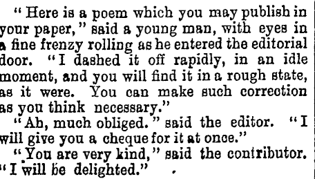 " Here is a poem which you may publish in yonr paper," said a young man, with eyes in a fine frenzy rolling as he entered the editorial door. "I dashed it off rapidly, in an idle moment, and you will find it in a rough state, as it were. You can make such correction as yon think necessary." "Ah, much obliged. " said the editor. "I will give you a cheque for it at onoe." "You are very kind," said the contributor. " I will be delighted." -