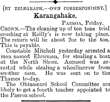 ♦ [by telegraph.--own correspondent.] Karangahake. Paeroa, Friday. Crown.—The cleaning up of ten tons trial crushing at Railly's is now taking place. The return will be about 2oz to the ton. This is payable. Constable Mitchell yesterday arrested a man named Ehurman, for stealing a boat at the North Shore. Accused was arrested while stealing a wheelbarrow from another man. He was sent on to the Thames to-day. The Ohinemuri School Committee are likely to get a fourth teacher appointed to the Paeroa school.