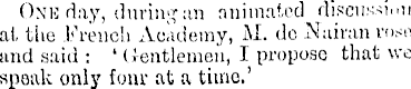 One day, during an animated discussion al. the French Academy, M. de Nairan rose and said : ' Gentlemen, I propose that we speak only foni' at a time.'