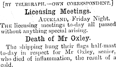 [HY TKLKOBAPH.— OWN COIUIKSVONDENT.] Licensing Meetings. Auckland, Friday Night. Thk licensing meetings to-day all passed without anything special arising. Death of Mr Oxley. The shipping hung their flags half-mast to-day in respect for Mr Oxley, senior, who died of inflammation, the result of a cold.