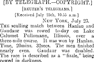 [BY TELEGRAPH.-COPYRIGHT.] [reuter’s telegrams.] [Received July 25th, 10.55 a.m.] New York, July 23. The sculling match between Hanlan and Gaudaur was rowed to-day on Lake Calumet Pullomann, Illinois, over a three-mile course. It was won by Hanlan. Time, 20mins. 32secs. The men finished nearly even. Gaudaur was disabled. The race is described as a “ fizzle,” being rowed in darkness.