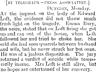 • [liv TELEGRAPH-PRESS ASSOCIATION.] DcNEIUN, Monday. At the inquest on the body of Kdward Loft, the evidence did not throw much fresli light on tho tragedy. Emma limy, the naice, stated that on Loft firing she got up and ran out of the house, when Loft followed her and tried to choke tier. She said she had seen quarrels between husband and wife, but he never struck her but once. He was of u jealous disposition. The jury returned a verdict of suicide while temporarily insane. Mrs Loft is still alive, but no hopes are entertained of her recovery.