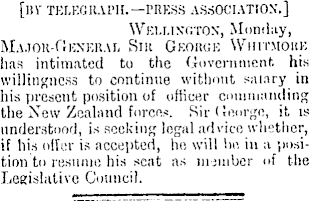 [by telegraph.—press association,] Wellington, Monday, Ma.ioh-Cenehal Sm George Whitmore has intimated to the Government his willingness to continue without salary in his present position of officer commanding the New Zealand forces. Sir George, it is understood, is seeking legal advice whether, if bis offer is accepted, he- will be, in a position to resume his seat as member of the Legislative Council.