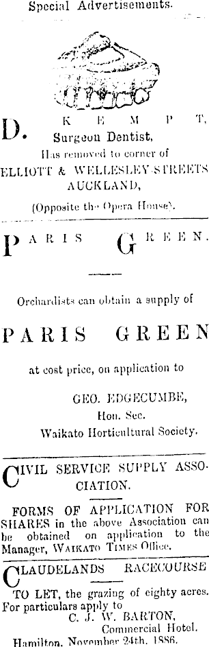 Special Advertisements. ' ■ * 4 --••... • * ,„' Dk k M I’ 'l'. • Surgeon Dentist, ELLIOTT k WKLLKSLKV-KTRKETS AUCKLAND, (Opposite til " Opera Orchardists can obtain a supply of PARIS GREEN at cost price, on application to GKO. KDGKCUMBK, Hon. Sec. Waikato Horticultural Society. IVIL SERVICE SUPPLY ASSOFORMS OF APPLICATION FOR SHARKS in the above Association can be obtained on application to the Manager, Waikato Ti.mks Olliee. QLAUDELANDS RACKGO URSE TO LET, the grazing of eighty acres. For particulars apply to C. J. W. BARTON, Commercial Hotel. Hamilton. November 24th. ISSfi. Has removed to earner of G CIATION.