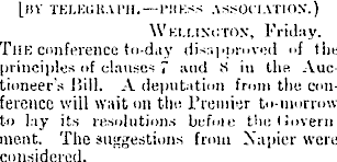 jI!V TEI.KUItAriI. —I‘IIKSS ASSOCIATION.) Wku.inoton, Friday. The conference to-day disapproved "f the principles of clauses 7 and 8 in the Auctioneer’s Hill. A deputation from the conference will wait on the Premier to-morrow to lay its resolutions befme theliovern ment. The suggestions from Napier were considered.