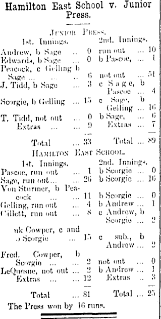 Hamilton East School v. Junior Press. Jrsion Ist, Tumults. -nil. Innings. Andrew, b Sago .. 0 run nut ... 10 Towards, b ... 0 b Pascoo, ... I Peacock, c (Tilling b •• n<<t out J. Tidclj b Sago - 3 cSa« o, b I’USCDO ... ‘1 Scorgio, b Culling - I"' c b ... (billing ... lb T. Titld, not nut ... 0 b Sage, ... 0 Extras » Extiaa ... Total ... Total ... HO IlAMii/rav East .School. Ist. Innings, 2nd. Innings. Pascoo, run out ... 1 b Scorgjo ... 0 Sago, runout 2li b Scorgio ... Hi Von Stunner, b Peacock 11 bScorgie ... 0 (billing, runout ... '1 b Andrew ... 1 Cillctt, run out ... 8 c Andrew, b Scorpio ... 2 uk Cowpur, c and ■> Scorgiu ... I-"’ c ™b., b Andrew ... 2 Ercd. Cow per, b Scorgio 2 not out ... 0 LeQuesne, not out ... 2 b Andrew ... 1 Extras 12 Extras ~ 2 Total ... 81 Total ... 2.1 The Press won by K> runs.