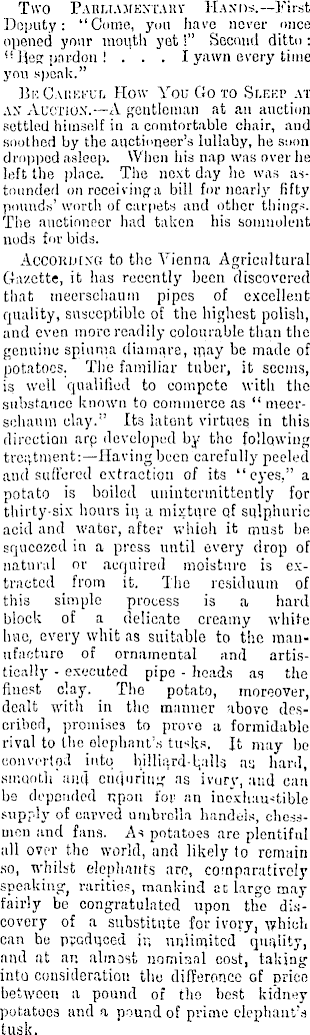 Two Parliamentary Hands.—First Deputy: “Come, you have never once opened your month yet!” Second ditto ; !i Beg pardon 1 . . . I yawn every time you speak.” Be Careeul How You Go to Sleep at an Auction. —A gentleman at an auction settled himself in a comfortable chair, and soothed by the auctioneer’s lullaby, he soon dropped asleep. When his nap was over lie left the place. The next day he was astounded on receiving a bill for nearly- fifty pounds’ worth of carpets and other tilings. Tbe auctioneer had taken his somnolent nods for bids. According to the Vienna Agricultural Gazette, it has recently been discovered that meerschaum pipes of excellent quality, susceptible of the highest polish, and even more readily colourable than the genuine spiunia diamare, ipay be made of potatoes. The familiar tuber, it seems, is well qualified to compete with tho substance known to commerce as “ meerschaum clay.” Its latent virtues in this direction arp developed by the following treatment; —Having been carefully- peeled and suffered extraction of its “eyes,” a potato is boiled unmtennittently for thirty-six hours iq a mixture qf sulphuric acid and water, after which it must he squeezed in a press until every drop of natural nr acquired moisture is extracted from it. Tho residuum of this simple process is a hard block of a delicate creamy white hue, every whit as suitable to the manufacture of ornamental and artistically- - executed pipe - heads as the finest clay. Tho potato, moreover, dealt with in tho manner above described, promises to prove a formidable rival to the elephant's tusks. It may ho converted into billiard-lpdls as hard, smooth and enduring ns ivory, and can bs depended upon for an inexhaustible supply- of carved umbrella handels, chessmen and fans. As potatoes are plentiful all over tho world, and likely to remain so, whilst elephants are, comparatively speaking, rarities, mankind ac large may fairly be congratulated upon the discovery of a substitute for ivory, which can he produced in unlimited quality, and at an almost nominal cost, taking into consideration tho difference of price between a pound of tho best kidney potatoes and a pound of prime elephant’s tusk.