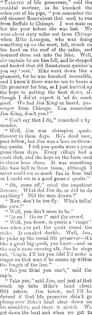 “Talkiso of life proservers,” said the truthful mariner, as he knocked the ashes out of his pipe, 11 you remember the old steamer Roustabout that used to run from Buffalo to Chicago. I was mate on her the year before she was lost. We were about sixty miles out from Chicago when Mike Linogan, who was doing something up on the mast, fell, struck on his head on the roof of the cabin, and bounced clean out into the lake. Well, the captain ho sec him fall, and he stopped and backed that old Roustabout quickor’n you say ‘ scat.’ Mike went down like a plummet, for ho was knocked insensible, and I know’d there was no use to heave a life preserver for him, sol just hurried up the boys in getting the boat down, although I did’ut expect it ’ud do much good. Wo had Jim King on board, passenger from Chicago. You remember Jim King, don’t you ?” “ Can't say that I do,” remarked a bystander. “ Well, Jim was champion quoitthrower iu them days. He’s dead now, poor fellow, but Jim was a boss on throwing quoits. I toll you quoits were a groat game them days. Every village had a (quoit club, and the boys on the farm used to throw boss shoos. It was something like base ball in those times, although I never could sec as much fun iu base ball as I could sec in a good game o' quoits.” “ Oh, come off,” cried the impatient listener. What did Jim do, or did ho do anything ? Did the man drown ?” “ Now, don’t bo too fly. Who's tellin’ the yarn ?” “ Well, you don’t seem to he.” “ Co on 1 Go on !” said the crowd. “ Well, you know, in quoits a ‘ ringer ’ was when you put the quoit round the stake. It counted double. Well, Jim, he |)ieks up the round life preserver—it’s like a great big quoit, you know—and as the uap’n came running aft, Jim he siuga out, 1 Cap’u, I’ll bet you fnlol I’d make a ringer on that man if he comes up within the length of the line.” “ Bet you 20dol you can’t,” said the cap’ll. “Take you,” said Jim, and just atthet miuit up bobs Mike’s head about (iOft astern. Jim threw, and I’ll bo darned if that life preserver didn’t go plump over Mike’s head clear down on his shoulders, and there it struck. Wc got down the boat and when wo got to