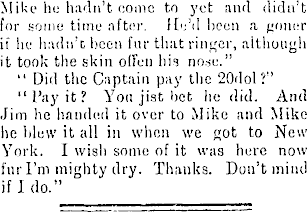 Mike he hadn’t come to yet and didn't for some time after. He’d been a goner if he hadn’t been fur that ringer, although it took the skin offen Ids nose.” “ Did tho Captain pay the 20dol?” “Pay it? You jist bet he did. And Jim he handed it over to Mike and Mike he blew it all in when we got to New York. I wish some of it was here now fur I’m mighty dry. Thanks. Don’t mind if 1 do.”