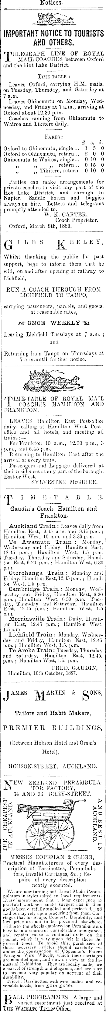 Notices. ~. IMPORTANT NOTICE TO TOURISTS ANDOTHERS. rpELEGRAPH LINE OF ROYAL X MAIL COACHKS between Oxford and the Hot Lake District. TIME-TABLE : Leaves Oxford, carrying H.M. mails, on Tuesday, Thursday, and Saturday at 7 a.m. Leaves Ohinemutu on Monday, Wednesday, and Friday at 7 a.m., arriving at Oxford about 12.30 p.m. Coaches running from Ohinemutu to Wairoa and Tikitere daily. Fakes : £ s. d. Oxford to Ohiuemutu, single ... 15 0 Oxford to Ohiuemutu, return... 2 0 0 Ohiuemutu to Wairoa, single... 0 10 0 „ „ „ return... 0 15 0 „ „ Tikitere, return 010 0 Parties can make arrangements for private coaches to visit any part of tha Hot Lake District, and through to Napier. Saddle horses and buggies always on hire. Letters and telegrams promptly attended to. W. K. CARTER, Coach Proprietor. Oxford, March Stb, 1536. GILES FEELEY, Whilst thanking the public for past support, begs to inform them that he will, on and after opening of railway to Liehfield, HUN A COACH THROUGH FROM LICHFIELD TO TAUPO, carrying passengers, parcels, and goods, at reasonable rates, £rONCE WEEKLY -sa Leaving Lichfield Tuesdays at 7 a.m. ; and Returning from Tniipo on Thursdays at 7 a.m.until further notice. fTiIME-TABLK OF ROYAL MAIL I COACHKS HAMILTON AlsD FRA.NKTON. LEAVES Hamilton East Post-office d;>ily, calling at Hamilton West Postoffice and ail hotels, and meeting al! trains :— For'FranUtou 10 a.m., 12.30 p.m., 3 p.m., and 5.45 p.m. Returning to Hamilton East after the arrival of every train, Passengers and Lugzagc delivered at theiiTcsiiieuees atany part of the borough, East or West. BYLVESTER McGUIRE. rr\ I M E- T A B L E. Gaudin's Coach, Hamilton and Frankton. Auckland Train : Leaves daily from Hamilton K;ist, 11. 10 a.in. ami 3.10 p.in. ; Hamilton West, 10 a.m. anil 3.30 p.m. Te Awamutu Train : Monday, Wednesday and Friday, Hainiltcm E;ist, 12.15 p.m. ; Hamilton West. 1.5 p.m. Tuesday, Thursday and Saturday, Hamilton East, 0.20 p.m. ; Hamilton West, 0.30 p.m. Otorohanga Train : Monday and Friday, Hamilton East, 12.15 p.m. ; Hamilton West, 1.5 p.m. Cambridge Train: Monday, Wednesday and Friday, Hamilton East, (i.20 p.m. : Hamilton West, (>.30 p.m. Tuesday, Thursday and Saturday, Hamilton Ka«t, 12.45 p.m. ; Hamilton West, 1.5 p.m. Morrinsville Train : Daily, Hamilton East, 12.45 p.m.; Hamilton West, 1.5 p.m Lichfield Train : Monday, Wednesday and Friday, Hamilton East, 12.45 p.m. ; Hamilton West, 1.5. p.m. Te ArohaTrain: Tuesday, Thursday and Saturday, Hamilton East, 12.45. p.m.; Hamilton West, 1.5. p.m. FRED. GAUDIN, Hamilton, 10th October, 1887. TAMES "T\/|ARTIN & OONS, Tailors and Habit Makers, PREMIER BUILDINGS, (Between Hobson Hotel and Oram's Hotel), HOBSON-STREET, AUCKLAND. NEW ZEALAND PERAMBULATOR FACTORY, 34 AND 3si, URICY-STRKET. %< 1 c ? T T~jT o° MESSRS COPEMAN & CLEGG, Practical Manufacturers of every description of Bassinettes, Perambulators, Invalid Carriages, <Src.; Repairs of every description neatly executed. Wi arc: now turning out Local Wade PcraniDulators in styles suited to local requirements. Every improvement that a lons experience as prartic.-il workmen cmiM suggest lias in their Hoods been rarefully studied and perfected, and Ladies may rely upon procuring from them Carriages that for Shape, Comtort, Durability, :u-.d low price are not to be procured elscwhcic. Hitherto the wheels employed on Perambulators have been a source of considerable annoyance, and repairs cause a continual drain on Ibe pocket, which is very much felt in these depressed times. To avoid this, purchasers of lliese necessary articles should carefully examine the construction of Copeman's Patent Paragon AVirc Wheels, which their carriages are mounted upon, and now on view at the Industrial Exhibition. They are locally made, are a marvel of strength and elegance, and are sure to become very popular on account of tbeir durability. Prices: liassinottes, with wire bodies and reversible hoods, from £2 to £3 10s. BALL PROGRAMMES-A large and varied assortment just received at Thjj Waikaxo 'Jtauj!* Office,