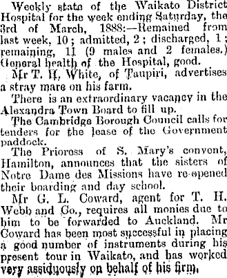Weekly state of the Waikato District Hospital for the \yeek ending Saturday, the 3rd of March, 1888:—Remained from last week. 10; admitted, 2 ; discharged, 1; remaining, 1J (9 males and 2 females.) Goperal health of the Hospital, good. Sfr T. If, White, of Taupiri, advertises a stray mare on his farm. There is an extraordinary vacaney in the Alexandra Town Board to fill up. The Cambridge Borough Council calls for tenders for the Joaso of tho Government paddock. The Prioross of S. Mary's convent, Hamilton, announces that the sisters of Notre Dame des Missions have re-opened their boarding and day school. jr.r G. L. Coward, agent for T. IT. Webb and .Co., requires all monies due to him to be forwafded to Auckland. Mr Coward has been most sjjeccssful in placing ij good number of instruments during his present tour in Waikato, and has worked veyjr RswfclQ'jefy QU behalf qi bis §m<