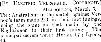 |Bv Electric Telegraph.—Copyright. 1 Mkldouhxk, March f>. Tub Australians in the match against Vernon's team made 220 in their first innings, being the same as that made by the Englishmen in their first inning-:. The principal scorers were: Horan, 07; Lyons,