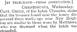 [BY TELECHAI'H—PKKSM ASSOCIATION. | CmusTCHUiicii, Wednesday. Oapt. Gbrun, of the ketch Clematis, states that the trousoi-s found near discovered three weeks ago near New Brighton are similar to those worn by Matthews, who was drowned wheu the ketch was stranded.