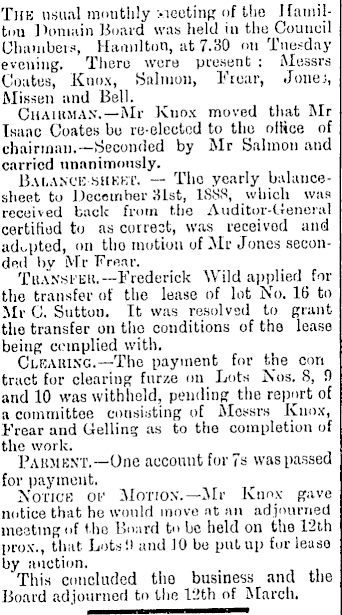 Tub usual monthly meeting of the Hamilton ]>omain Board was held in tho Council Chambers, Hamilton, at 7.30 on Tuesday evening. There were present : Messrs Coatee, Knox, Salmon, I'icar, Jonej, Missen and Bell. Chaiumax. —Mr .Knox moved that Mr Isaac Coates bo- re-elected to tho olHce of chairman.—Seconded by Mr Salmon and carried unanimously. Balanue-shkkt. — The yearly balancesheet to December 81st, ISSB, which was received back from the Auditor-General certified to as correst, was received and adapted, on tho motion of Mr Jones seconded by Mr Frnnr. TiiANSt'EU.—Frederick Wild applied for the transfer of the lease of lot No. IB to Mr G. Sutton. It was resolvsd to grant the transfer on tho conditions of the lease being complied with. Cleamxg.—-Tho payment for the con tract for clearing furze on Lots Nos. 8, 0 and 10 was withheld, pending the report of a committee consisting of Messrs Knox, I'rear and Gelling as to the completion of the work. Pahmbnt.—One account for 7s was passed for payment. Nonc'K oi' Motion. —Mr Ktwx gave notice that he would move at an adjourned meeting of the Board to be held on the 12th prox., that. Lotsll and 10 bo put up for lease by auction. This concluded the business and the Board adjourned to tho 12th of March.