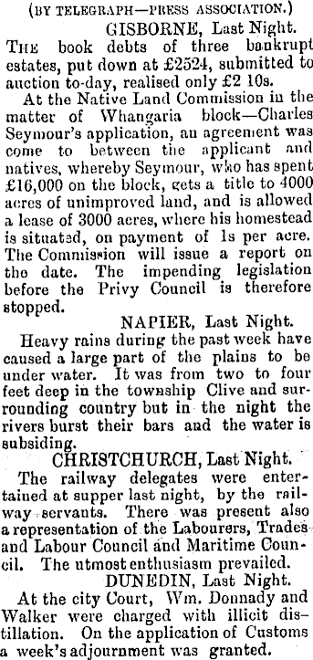 (by telegraph—press association.) GISBORNE, Last Night. The book debts of three bankrupt estates, put down at £2524, submitted to auction to-day, realised only £2 10s. At the Native Land Commission in the matter of Whangaria block—Charles Seymour's application, an agreement was come to between the applicant and natives, whereby Seymour, w!>io has spent £16,000 on the block, Rets a title to 4000 acres of unimproved land, and is allowed a lease of 3000 acres, where his homestead is situatsd, on payment of Is per acre. The Comniisoion will issue a report on tho date. The impending legislation before the Privy Council is therefore stopped. NAPIER, Last Night. Heavy rains during the past week have caused a large part of the plains to be under water. It was from two to four feet deep in the towaship Clive and surroundiog country but in the night the rivers burst their bars aad the water is subsiding. CHRIBTCHURCH, Last Night. The railway delegates were entertained at supper last night, by the railway servants. There was present also a representation of the Labourers, Trades and Labour Council and Maritime Council. The utmost enthusiasm prevailed. DUNEDIN, Last Night. At the city Court, VVm. Donnady and Walker were charged with illicit distillation. On the application of Customs a week's adjournment was granted.