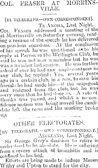 COL. FIiASER AT MOll-ELVS-VILIiE. (BY TIIMSOIUI'H—OWN COUHIWL'ONDKK'I'). Tk Ahoha, Last Niglit. Col. Kiiaseii addressed a meeting of the at Morrinsville on Saturday cveuing, reading a resume of the speed) ho has delivered on previous occasions. At the conclusion of his spnr.ch ho was questioned n» to his reply at Pacroa re the Wellington Club, he said'lks wan not now a member but lie was was a member last session. Ho was further askud if over lie hud any uni>i.--\Huitness; in any club, he replied : Yes, several years iißo in a certain club, in a row, to save bis friond.-i ho had nude bii'-'lf Hi" scapegoat and rescued from fliu dull, but, ho was soi-.-v since that ho had done .■=;.. A vote of thanks was paused, ;i»d whilst ii no-ui.ii-Hdi-uce motion was boint,' moved the candidato loft the room and tho mooting broke OTHKIt ELECTOUATE.S. fuv Tii'.KOKAi'it. — ow:; eonKEsroNDis.vr.] Auckland, Laut Night. Sir George Grey's decision to retire is , n|l | t .iriUir«l t.i, bi> alwi.l.itn. ][« ik suffurillg from a severe attack of bronchitis and is confined to his bed. Efforts are being made to induce Messrs Withy and Upton to stand for the city.