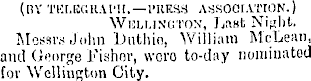 (HV TKr.BGIIAI'H.—IMIRS3 ASSOCIATION.) WELLINGTON, Last Nijjhl. Messrs John Dnthio, William McLean, and Oorge Fishor, wore to-day nominated for Wellington City.