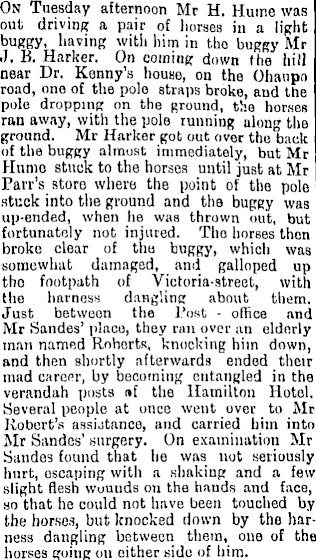 On Tuesday afternoon Mr H. Hume was out driving a pair of horses in a light buggy, having with him in tho buggy Mr «J. B. Harker. On coming down the hill near Dr. Kenny's house, on the Ohaupo road, one of the polo straps broke, and the pole dropping on the ground, the horses ran away, with the pole running along the ground. Mr Harker got out over the back of the buggy almost immediately, but Mr Hnmo stuck to the horses until just at Mr Parr's store where the point of the pole stuck into the ground and the buggy was up-ended, when he was thrown out, but fortunately not injured. Tho horses then broke clear of the buggy, which was somewhat damaged, and galloped up tho footpath of Victoria-street, with the harness dangling about them. Just betweon the Post - office and I Mr Sandes' place, they ran over an elderly inan named Roberts, knocking him down, and then shortly afterwards ended their mad career, by becoming entangled in the verandah posts »f the Hamilton Hotel. Several people at once went over to Mr Robert's assistance, and carried him into Mr Sandes' surgery. On examination Mr Sandes found that he was not seriously hurt, escaping with a shaking and a few slight flesh wouuds on the hands and face, so that he could not have been touched by the horses, but knocked down by the harness dangling between them, one of the horses going ou either side of him.