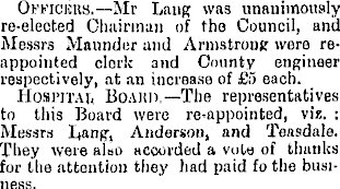 Officers.—Mr Lang was unanimously re-elected Chairman of the Council, and Messrs Maunder and Armstrong were reappointed clork and County engineer respectively, at an increase of £5 each. Hospitai, Board,—The representatives to this Board were re-appointed, viz. : Messrs Liang 1 , Anderson, and Teasdale. They were also acoorded a vole of thanks for the attention they had paid fo the business.