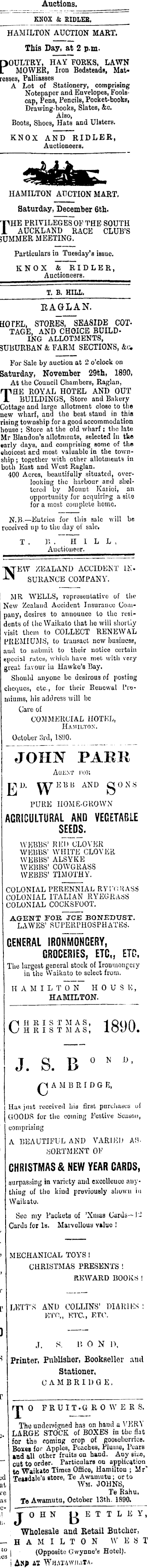 Auctions. KNOX & EIDLEB. HAMILTON AUCTION MART. This Day. at 2 p.m. POULTRY, HAY FORKS, LAWN MOWER, Iron Bedsteads, Mat* teases, Palliasses A Lot of Stationery, comprising Notepaper and Envelopes, Foolscap, Pens, Pencils, Pocket-books, Drawing-books, Slates, &c. Also, Bootß, Shoes, Hats and Ulsters. KNOX AND RIDLER, Auctioneers. HAMILTON AUCTION MART, Saturday, December 6th< THE PRIVILEGES OF THE SOUTH AUCKLAND RACE CLUB'S SUMMER MEETING. Particulars in Tuesday's issue. KNOX & RIDLER, Auctioneers. T. B. HILL. RAGLAN. HOrEL, STORES, SEASIDE COTTAGE, AND CHOICE BUILDING ALLOTMENTS, SUBURBAN & FARM SECTIONS, &G. For Sale by auction at 2 o'clock on Saturday, November 29th, 1890, At the Council Chambers, Raglan, The royal hotel and out BUILDINGS, Store and Bakery Cottage and large allotment close to the new wharf, and the best stand in this rising township for a good accommodation house ; Store at the old wharf; the late Mr Blandon's allotments, selected in tke early days, and comprising some of the ehoicest acd most valuable in the township ; together with other allotments in both East and West Raglan. 400 Acres, beautifully situated, overlooking the harbour and sheltered by Mount Kaiioi, an opportunity for acquiring a site for a most complete home. N.B. —Entries for this sale will be received up to the day of sale. T . 11 . HILL, Auctioneer. NEW ZEALAND ACCIDENT INSURANCE COMPANY. MR WELLS, representative of the New Zealand Accident Insurance Company, desires to announce to the residents of the Waikato that he will shortly visit them to COLLECT RENEW AL PREMIUMS, to transact new business, aud to submit to their notice certain epccisl rates, which have met with very great favour iu Hawke'a Bay. Should anyone be desirous of posting chcqucs, etc., for their Keucwal Premiums, his address will he Care of COMMERCIAL HOTEL, Hamilton". October 3rd, 18' JO. JOHN PARK Aaii.vr con D. yy EBB AND gO X S PURE liOME-GROWX AGRICULTURAL AND VEGETABLE SEEDS. WEBBS' Ji 1CI» CLOVER WEBBS' WHITE CLOVER WEBBS' ALSYKE WEBBS' COWGRASS WEBBS' TIMOTHY. COLONIAL PERENNIAL RYITiiiASS COLONIAL ITALIAN RYEGRASS COLONIAL COCKSFOOT. AGENT FOR JCE BONEDUST. LAWES' SUPERPHOSPHATES. GENERAL IRONMONGERY, GROCERIES, ETC,, ETC, The largest general stock of Ironmongery in the VVaikato to select from. ' I-I AMI L T ON~ HOUSE, HAMILTON. CHRISTMAS, IQUfI HRISTMAS, 10JU. J. 3. B 0 N JJ ' OAMBR I D G E, Has just received his first purchases uf ( GOODS for the coming Festive Season, ' comprising A BEAUTIFUL AND VARIED AS- > SORTMENT OF CHRISTMAS & NEW YEAR CARDS, surpassing in variety and excclleuue anything of the kind previously shown in Waikato. Sec my Packets of 'Xnias Cards—Jk Cards for Is. Marvellous value ! ' MECHANICAL TOYS 1 , CHRISTMAS PRESENTS ! REWARD BOOKS ! r r LETT'S AND COLLINS' DIARIES : F/ra, ETC., ETC. D J. S. P. O N I>, s printer, Publisher, Bookseller ami Stationer, CAMBRIDGE. T rjn O FRUIT-GROWERS. Tho undersigned has on hand u VER\ e . LARGE STOCK of BOXES in the flat for the coming crop of gooseberries. Boxes for Apples, Peaches, Plume, Pears and all other fruits on hand. Any eiae, ~~ out to order. Particulars on application to Waikato Times Office, Hamilton ; Mr w ed Teudale's store, Te Awamutu; or to at Wh. JOHNS, ve Te Rahu. as le Awamutu, October 13th. 1890. '! JOHN jj ETTL EY, Wholesale and Retail Butcher, — HAMILTON WEST I (Opposite Gwynne's Hotel). i Asj> ax Wh.vmwjuta.