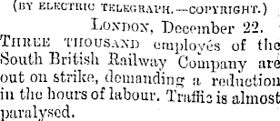 (1!Y ELECTRIC TKLKOBAI'H.— COPYRIGHT.) Loxnox, December 22. - TIIH.EE thousaxd employes of the South British Railway Company are out on strike, demanding a reduction in the hours of labour. Tniffia is almost paralysed.