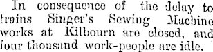 In consequence of the delay to trains Singer's Sewing Machine works at Kilbourn are closed, and four thousand work-people are idle.