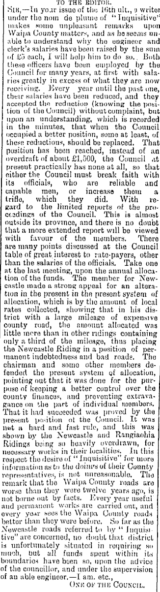 I TO THE BDITOH. i Sin,— In yo.u' issue of tin; Kith ult,, a writer under the nom de plume of "Inquisitive" I makes Home unpleasant remarks upon Waipa County matters, and as beseems unable to understand why the engineer and clerk's salaries have been raised by the sum of to each, I will holp him to do so., Both these officers have been employed by the ' Council for many years, at first with salaries groatly in excess of what they are now receiving. Kvery year until the past one, their salaries have been reduced, and they accepted tlio reduction (knowing the position of the Council) without complaint, but upon an understanding, which is recorded in the minutes, that when tho Council occupied a better position, some at least, of these reductions, Bhould be replaced. That position lias been reached, instead of an overdraft of about £1,500, the Council at preaeut practically has none at all, so that either the Council must break faith with its officials, who are reliable and capable men, or increase them a trifle, which they did. With regard to the limited reports of the proceedings of the Council. This is almost outside its province, and there is no doubt that a more extended report will be viewed with favour of the members. There are many points discussed at the Council table of great, interest to rato-payers, other than the salaries of the officials. Take one at the last meeting, upon the annual allocation of the funds. The member for Newcastle made a strong appeal for an alteration iu the present in the present system «f allocation, which is by tho amount of local rates collected, showing that in his district with a large mileage of expensive county road, the amount allocated was little more than in other ridings containing only a third of the mileage, thus placing the Newcastle Riding in a position of permanent indebtedness and bad roads. The chairman and somo other members defended tho present system of allocation, pointing out that it was done for tho purpose of keeping a better control over the county finances, and preventing extravagance on the part of individual members. That it had succeeded was proved by the present position ol the Council. It was nut u hard and fast rule, and this was shown by the Newcastle and Rangianhia Ridings being so heavily ovordrawn, for necessary works in their localities. In this respect the desire of " Inquisitive" for more information as to the doiiu's of their County representatives, is not unreasonable. Tlio remark that the Waipa County roads are worse than they were twelve years ago, is not borne out by facts. Every year useful and permanent works are carried out, and every ye.ir sees tho Waipa County roads bettor than they were before. So far as the Newcastle roads referred to by " Inquisitive" are conuerned, no doubt that district is unfortunately situated in requiring so muib, but all funds spent within its boundaries have been so, upon tho advice of the councillor, and under the supervision of an able engineer.—l am. etc., Osk of the Council. ' ', i