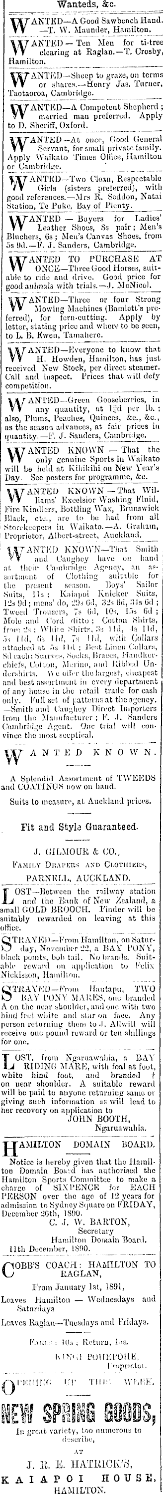 ; Wanteds, &c. WANTED— A Good Sawbcnoh Hand. —T. W. Maunder.Jlamilton,. __ WANTED— Ten Men for ti-trce cleariug at Raglan.—T. Crosby, | Hamilton. WANTED— Sheep to graze, on terms or shares.—Henry Jas. Turner, , Taotaoroa, Cambridge. WANTED— A Competent Shepherd ; married man preferred. Apply | to D. Sheriff, Oxford. WANTED— At once, flood General Servant, for small private family. Apply Waikato Times OHice, Hamilton or Cambridge. ' WANTED-Two Clean, Respectable Girls (sisters preferred], with good references.—Mrs R. Seddon, Natai Station, Te Puke, Bay of Plenty. WANTED — Buyers for Ladies' Leather Shoes, Ss> pair; Men's Bluchers, 6s; Men's Canvas Shoes, from 5s l Jd.—F. J. Sanders, Cambridge. WANTED TO PURCHASE AT ONCE—Three Good Horses, suitable to ride and drive. Good price for good animals with trials. —J. McNicol. \XT ANTED—Three or four Strong W Mowing Machines (Bamlctt's preferred), for fern-cutting. Apply by letter, stating price and where to be seen, to L. B. Ewen, Tamahere. WANTED— Everyone to know that H. Howden, Hamilton, has just received New Stock, per direct steamer. C'ail and inspect. Prices that will defy competition. H RANTED —Green Gooseberries, in any quantity, at l:[-d per lb. : also, Plums, Peaches, Quinces, &c, &c, as the season advances, at fair prices in quantity.—F. J. Sanders, Cambridge. WANTED KNOWN - That the only genuine Sports in Waikato will be held at Kiliikihi on New Year's Day. See posters for programme, itc. WANTED KNOWN—That Williams' Excelsior Washing Fluid, Fire Kindlers, Bottling Wax, Brunswick Black, etc., are to be had from all Storekeepers in Waikato.—A. Graham, Proprietor, Albert-street, Auckland. W- ANTED KNOWN—That Smith and Caughey have on hand at their Cambridge Agency, an assortment of Clothing suitable for the present season. Boys' Sailor Suits, lis ; Kaiapoi Knicker Suits, 12s Ud; mens' do, "J!).* (id, 32s lid, .'Vis Gd ; Tweed Trousers, 7s Ud, 10s, 15s 6d ; Mole and Cord ditto : Cotton Shirts, from is ; White Shirts, 3s lid, Is lid, .h lid, tin Ud, 7s I Id, wir.li Collars attached at ."is I Id ; Best Linen Collars, Sd each; Scarves, Socks, Braces, Handkerchiefs, Cotton, Merino, and Ribbed Undershirts. \\ e oiler the largest, cheapest | and best assortment in every department of any house in the retail trade for cash only. Full set of patterns at the agency. —Smith and Caughey Direct Importers from the Manufacturer; F. •). Sanders Cambridge Agent. One trial will convince the most sceptical. lir A NT E D KNOWN. A Splendid Assortment of TWEEDS and COATINGS now on baud. Suits to measure, at Auckland prices. Fit and Style Guaranteed. J. GILMOUR & CO., Family Drapers and Clothiers, RARNELL, AUCKLAND. LOST— Between the railway station and the Rank of New Zealand, a small GOLD BROOCH. Finder will be suitably rewarded on leaving at this office. STRAYED— From Hamilton, on Saturday, November 22, a BAY PONY, black points, bob tail. No brandy. Suitable reward on application to Felix Nickisaon, Hamilton. STRAYKD-From Ifautapu, TWO ' BAY PONY MARES, one branded A on the near shoulder, and one with two hind feel, white and star on face. Any person returning them to .1. Allwill will • receive one pound reward or ten shillings for one. LOST, from Ngaruawahia, a BAY RIDING MARE, with foal at foot, white hind foot, and branded I on near shoulder. A suitable reward will be paid to anyone returning same or giving such information as will lead to her recovery on application to JOHN BOOTH, Ngaruawahia. TTAMILTON DOMAIN BOARD. Notice is hereby given that the Hamilton Domain Boavd has authorised the Hamilton Sports Committee to make a charge of SIXPENCE for EACH PERSON over the ago of 12 years for admission to Sydney Square on FRIDAY, ' December 20th, 1800. C. .J. W. BARTON, Secretary Hamilton Domain Board. Uth December, 1S!)0. COBB'S COACH: HAMILTON TO RAGLAN, From January Ist, 1891, Leaves Hamilton — Wednesdays and Saturdays Loaves Raglan—Tuesdays and Fridays. (''.m;i.s ; 10s ; Return, Lis. KINGI POHEI'OHE, ["'•opricloi. ryEi.'ir.'G \,v r \i\\r. whFK'. new spim esees,; In I'rcat variety, too numerous to describe, AT J. li. E. HATKICIv'S, KAIAPOI HOUSE, HAMILTON.