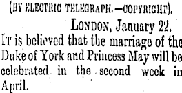 (BV KLKOTBIO TEWMBAPH.—OOPtBIOUT). London, January 22. It is bclioved that the marriage of the Duke of York and Princess May will be celebrated, iu the second week in April.