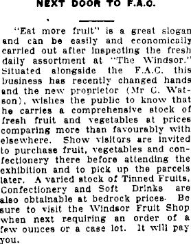NEXT DOOR TO F.A.C. “Eat more fruit" is a great slogan and can be easily and economically carried out after Inspecting the fresh daily assortment at "The Windsor.” Situated alongside the F.A.C. this business has recently changed hands and the new proprietor (Mr C. Watson), wishes the public to know that he carries a comprehensive stock of fresh fruit and vegetables at prices comparing more than favourably with elsewhere. Show visitors are invited to purchase fruit, vegetables and confectionery there before attending the exhibition and to pick up the parcels later. A varied stock of Tinned Fruits, Confectionery and Soft Drinks are also obtainable at bedrock prices- Be sure to visit the Windsor Fruit Shop when next requiring an order of a few ounces or a case lot. It will pay you.