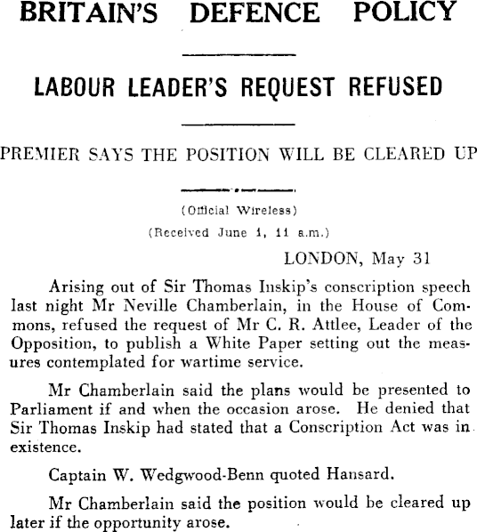 BRITAIN’S DEFENCE POLICY LABOUR LEADER’S REQUEST REFUSED PREMIER SAYS THE POSITION WILL BE CLEARED UP (Official Wireless) (Received June 1, 11 a.m.) LONDON, May 31 Arising out of Sir Thomas Inskip’s conscription speech last night Mr Neville Chamberlain, in the House of Commons, refused the request of Mr C. R. Attlee, Leader of the Opposition, to publish a White Paper setting out the measures contemplated for wartime service. Mr Chamberlain said the plans would be presented to Parliament if and when the occasion arose. He denied that Sir Thomas Inskip had stated that a Conscription Act was in existence. Captain W. Wedgwood-Benn quoted Hansard. Mr Chamberlain said the position would be cleared up later if the opportunity arose.