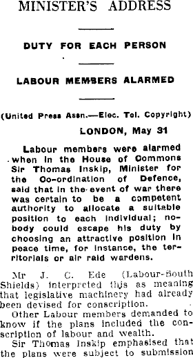 MINISTER’S ADDRESS DUTY FOR EACH PERSON LABOUR MEMBERS ALARMED (United Press Assn. —Elec. Tel. Copyright) LONDON, May 31 Labour members were alarmed when In the House of Commons Sir Thomas Inskip, Minister for the Co-ordination of Defence, said that in the event of war there was certain to be a competent authority to allocate a suitable position to each Individual; nobody could escape his duty by choosing an attractive position in peace time, for instance, the territorials or air raid wardens. Mr J. C. Ede (Labour-South Shields) interpreted thjs as meaning that legislative machinery had already been devised for conscription. Other Labour members demanded to know if the plans included the conscription of labour and wealth. Sir Thomas Inskip emphasised that the plans were subject to submission