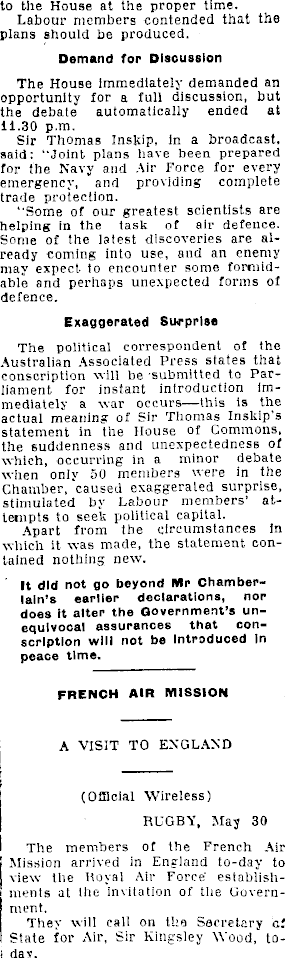 to the House at the proper time. Labour members contended that the plans should be produced. Demand for Discussion The House immediately demanded an opportunity for a full discussion, but the debate automatically ended at 11.30 p.m. Sir Thomas Inskip, in a broadcast, said: “Joint plans have been prepared for the Navy and Air Force for every emergency, and providing complete trade protection. “Some of our greatest scientists are helping in the task of air defence. Some of the latest discoveries are already coming into use, and an enemy may expect, to encounter some formidable and perhaps unexpected forms of defence. Exaggerated Surprise The political correspondent of the Australian Associated Press states that conscription will be submitted to Parliament- for instant introduction immediately a war occurs—this is the actual meaning of Sir Thomas Inskip’s statement in the House of Commons, the suddenness and unexpectedness of which, occurring in a minor debate when only 50 members were in the Chamber, caused exaggerated surprise, stimulated by Labour members’ attempts to seek political capital. Apart from the circumstances in which it was made, the statement contained nothing new. It did not go beyond Mr Chamberlain’s earlier declarations, nor does it alter the Government’s unequivocal assurances that conscription will not be introduced In peace time. FRENCH AIR MISSION A VISIT TO ENGLAND j (Official Wireless) RUGBY, May 30 I The members of the French Air I Mission arrived in England to-day to | view the Royal Air Force establisht ments at the invitation of the Government. { They will call on the Secretary cf I State for Air, Sir Kingsley Wood," toi day.