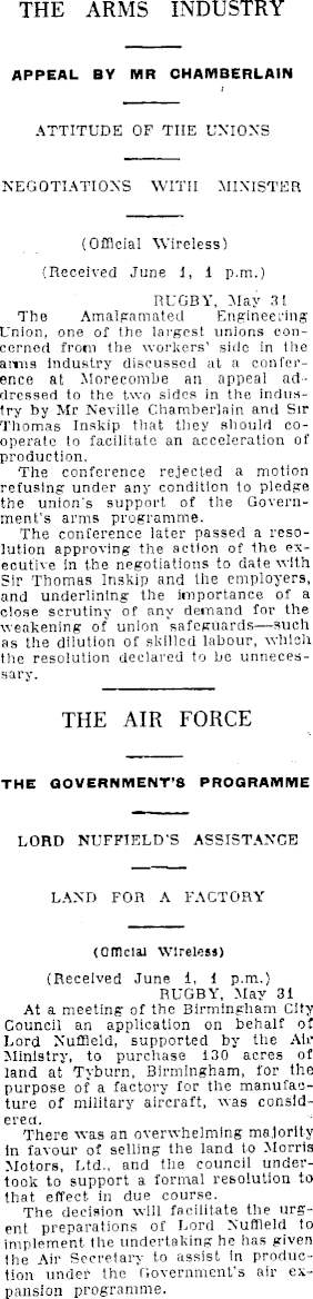 THE ARMS INDUSTRY APPEAL BY MR CHAMBERLAIN ATTITUDE OF THE UNION'S NEGOTIATIONS WITH MINISTER (Official Wireless) (Received June 1, 1 p.m.) RUGBY, May 31 The Amalgamated Engineering Union, one of the largest unions concerned from the workers’ side in the amis industry discussed at a conference at Morecombe an appeal addressed to the two sides in the industry by Mr Neville Chamberlain and Sir Thomas Inskip that they should cooperate to facilitate an acceleration of production. The conference rejected a motion refusing under any condition to pledge the union’s support of the Government’s arms programme. The conference later passed a resolution approving the action of the executive in the negotiations to date with Sir Thomas Inskip and the employers, and underlining the importance of a close scrutiny of any demand for the weakening of union safeguards—such as the dilution of skilled labour, which the resolution declared to be unnecessary. THE AIR FORCE THE GOVERNMENT’S PROGRAMME LORD NUFFIELD'S ASSISTANCE LAND FOR A FACTORY (Official Wireless) (Received June 1, 1 p.m.) RUGBY, May 31 At a meeting of the Birmingham City Council an application on behalf of Lord Nuffield, supported by the Air Ministry, to purchase 130 acres of land at Tyburn, Birmingham, for the purpose of a factory for the manufacture of military aircraft, was considered. There was an overwhelming majority in favour of selling the land to Morris Motors, Ltd., and the council undertook to support a formal resolution to that effect in due course. The decision will facilitate the urgent preparations of Lord Nuffield to implement the undertaking he has given the Air Secretary to assist in production under the Government’s air expansion programme.