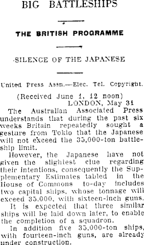 BIG BATTLESHIPS THE BRITISH PROGRAMME SILENCE OF THE JAPANESE United Press Assn. —Elec. Tel. Copyright. (Received June 1, 12 noon) LONDON, May 31 The Australian Associated Press understands that during the past six weeks Britain repeatedly sought a gesture from Tokio that the Japanese will not e'xceed the 33,000-ton battleship limit. However, the Japanese have not given the slightest clue regarding their intentions, consequently the Supplementary Estimates tabled in the House of Commons to-day includes two capital ships, whose tonnage will exceed 33.000, with sixteen-inch guns. It is expected that three similar ships will lie laid down later, to enable the completion of a squadron. In addition five 35,000-ton ships, with fourteen-inch guns, are already under construction.