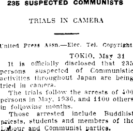 235 SUSPECTED COMMUNISTS TRIALS IN CAMERA United Pre?« Assn.—Elec. Tel. Copyright. TOKIO, May 31 It is officially disclosed that 235 persons suspected of Communistic activities throughout Japan are being tried in camera. The trials follow the arrests of 400 persons in May. 1930, and 1100 others in following months. Those arrested include Buddhist priests, students and members of the Labour and Communist parties.