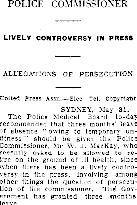 POLICE COMMISSIONER LIVELY CONTROVERSY IN PRESB ALLEGATIONS OF PERSECUTION United Press Assn.—Elec. Tel. Copyright. SYDNEY, May 31. The Police Medical Board to-day recommended that three months' leave of absence " owing to temporary unfitness " should be given the Police Commissioner, Mr W. J. Mac Kay, who recently asked to be allowed to retire on the ground of ill health, since when there has been a lively controversy in the press, involving among other things the question of persecution of the commissioner. Thd Government has granted three months’ leave.