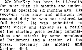 Mr Mac Kay has been In ill-health for more than 12 months and underwent an operation six months ago. His recovery was slow and although he resumed duty he was not restured to full health. He was submitted to great worry and anxiety as a result of the starting price betting commissions and attacks by some members of Parliament and a section of the press. Recently his mother and brother died.