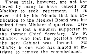 Those trials, however, are not believed by many to have caused Mr Mac Kay to seek retirement. It Is even said by his friends that his application to the Medical Board was inspired from Ministerial quarters. Certainly he lost a staunch supporter in (he former Chief Secretary, Mr F. Chaffey, who lost his portfolio when the new Cabinet was formed. Mr Chaffey is one who has hinted at intrigue to remove the commissioner.