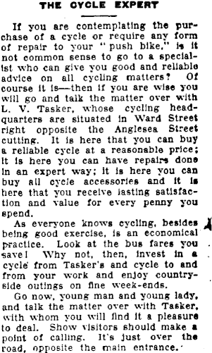 THE CYCLE EXPERT If you are contemplating the purchase* of a cycle or require any form of repair to your “ push bike,” is it not common sense to go to a specialist. who can give you good and reliable advice on all cycling matters? Of course it is—then if you are wise you will go and talk the matter over with L. V. Tasker, whose cycling headquarters are situated in Ward Street right opposite the Anglesea Street cutting. It is here that you can buy a reliable cycle at a reasonable price; It is here you can have repairs done in an expert w*ay; it is here you can buy all cycle accessories and it is here that you receive lasting satisfaction and value for every penny you 6pend. As everyone knows cycling, besides being good exercise, is an economical practice. Look at the bus fares you save! Why not, then, Invest in a cycle' from Tasker’s and cycle to and from your work and enjoy countryside outings on fine week-ends. Go now, young man and young lady, and talk the matter over with Tasker, with whom you will find it a pleasure to deal. Show visitors should make a point of calling. It’s just over the road, opposite the main entrance.