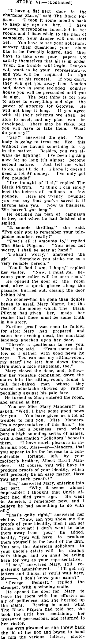 STORY Vl. (Continued) “I have a flat next door to the charming Marie,” said The Black Pilgrim. ‘‘l took it some months back to keep my eye on her. I have several microphones concealed in her rooms and I listened-in to the plan of campaign. Your danger will not start yet. You have to see your solicitors; answer their questions; your claim has to be formally lodged, and they have to take over your papers \to satisfy themselves that all is in order Then, the trouble will begin. Georgi.f. will want to be your representative, and you will be required to sign papers at his request. If you don't, they will get you away from London and, down in some secluded country house you will be persuaded until you do sign. The best thing is for you to agree to everything and sign the power of attorney for Georges. He will not keep it long. If you agree ■with all their schemes we shall be able to meet, and my plan can be developed. There may be risks, but you will have to take them. What do you say?” “Say?” answered the girl. “Nobody is going to treat me like this without me having something to say in the matter. Besides, you can always die fighting! I’ve been fighting now for so long it’s almost become second nature. Just tell me what to do, and I'll do it. 1 hope it doesn't need a lot If money. I've only got five pounds!” “I've thought of that,” replied The Black Pilgrim. “I think I can safely lend the heiress of millions a few pounds. Here are twenty pounds; you can say that you've saved it if anyone asks you. Now to business. We haven't got long.” He outlined his plan of campaign to her, and when he had finished she smiled. “It sounds thrilling,” she said. “I’ve only got to remember your telephone number, really I” “That’s all it amounts to,” replied The Black Pilgrim. “You need not worry, I shall be near at hand.” “I shan’t worry,” answered the girl. “Somehow you strike me as a very reliable person.” i “You'll find I am, I hope,” replied her visitor. “Now, I must go, because your caller will be here soon.” He opened the door of the room and, after a quick glance along the passage, hurried out, closing the door behind him. No sooner-had he gone than doubts began to assail Mary Marne, but the feel of the money which The Black Pilgrim had given her, made her realise that there must be some truth in his story. Further proof was soon to follow, for after Mary had prepared and eaten her evening meal, the smirking landlady knocked upon her door. "There’s a gentleman to see you, Miss,” she said. “From some solicitors so I gather, with good news he says. You can use my sitting-room, my He's such a nice gentleman, too.” Mary closed the door, and, following her voluable companion down the stairs into the sitting-room, found a tall, fair-haired man whose tiny waxed moustache showed up rather peculiarly against his pale face. He turned as Mary entered the room, and smiled at her. "You are Miss Mary Manders?” he asked. “Well, I have some good news for you. You have given us a lot of trouble to find you, Miss Manders. I'm a representative of this firm.” He handed her a business card which bore a high sounding series of names, with a designation "Solicitors” beneath them. “I have much pleasure in informing you. Miss —er —Manders, that you appear to be the heiress to a considerable fortune, left by your mother’s brother, Albert David Manders. Of course, you will have to produce proofs of your identity, which will probably be an easy matter. Have you any such proofs?” “Yes,” answered Mary, entering into her part. “Why, it seems almost impossible! I thought that Uncle Albert had died years ago. He went to America, I remember now, and I believe he had something to do with oil.’/ “That’s quite right,” answered her visitor. “Now, can you show me the proofs of your identity, then I can set things moving! I don’t want to take them away from you,” he added, hastily, “you will have to produce them yourself to the head of the firm. You see, the American solicitors to your uncle's estate will be dealing with things, and we shall be acting here for you as your representative. “I see,” answered Mary, still registering astonishment. “I’ll get my letters and things, if you’ll wait here, Mr , 1 don't know your name?” “George Bennett,” replied the stranger, with a winning smile. He opened the door for Mary to leave the room with too effusive an air of politeness, and she hurried up the stairs. Bearing in mind what The Black Pilgrim had told her, she took the little box containing her treasured possessions, and returned to her visitor. His eyes gleamed as she threw back the lid of the box and began to hand to him the various letters, photo-