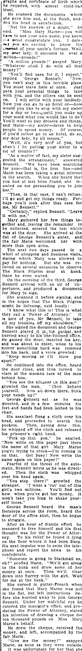 graphs and certificate of birth which he required, with almost child-like trust. He scanned the documents which she gave him and, at the finish, nodded his head in satisfaction. "Not the shadow of a doubt,” he said. “Miss Mary Marne—you will h*v» to use your own name, you know •4 must congratulate you. I darel n>u are excited to know the | .rcwmut of your uncle's fortune. Weil, '! uiy a«r lady, it amounts to over a I Miillion —pounds !” ! “A million pounds!” gasped Mary. ‘ "Whatever shall I do with all that money?” "You'll find uses for it, I expect," replied ‘George Bennett.’ “Now, you can’t stay in this terrible place. You must leave here at once. Just pack your personal things to take with you, and the others can be sent on. I will settle with your landlady. Now you can go to an hotel or—how would you like to stop with my sister for a day or two—until you make up your mind what you would like to do ? You'll want to buy dresses and things, and Marie—my sister —loves to help people to spend money. Of course, if you’d rather go to an hotel, do so, my dear lady, by all means.” “Well, it's very nice' of you, but shan't I be putting your sister to a lot of trouble?” “As a matter of fact, my sister suggested the arrangement,” answered Bennett. “We have been searching for you—that is, the firm has—and Marie has been taking a great interest in the search. When she heard that you had at last been found, she insisted on me persuading you to join her.” "Then, in that case, I can't refuse. I'll go and get my things ready. Perhaps you’ll look after that case for me, Mr Bennett.” “Certainly,” replied Bennett. “Leave it with me.” Mary gathered her few things together and, leaving the remainder to be collected, entered the taxi which was at the door. She arrived at the flat of George Bennett’s sister, and the fair Marie welcomed her with more than open arms, f The next two days passed in a whirl of shopping and business visits, during which Mary was allowed to pay for nothing. But she was relieved on several occasions to observe The Black Pilgrim near at hand. Once he even waved. On the morning of the third, George Bennett arrived with an air of importance, and produced a document for Mary to sign. She scanned it before signing, and in the hopes that The Black Pilgrim might be listening, said loudly; “I know what this is! This is what they call a 'Power of Attorney.’ It is nice of you, Mr Bennett, to take all my troubles off my shoulders.” She signed the document and George Bennett placed it in., his pocket .-and hurried away to his one-roomed office. He gained the door, inserted his key, and was about to enter, when to his horror something hard was rammed into his back, and a voice growled; “Keep moving or I’ll blow you apart 1” He continued into the office, heard the door close, and then turned to stare at the masked face of the man behind him. “You see the silencer cn this gun!” growied the man. “Then behave nourself. Now si*, down there. Stick your hands up!” George Bennett sat as he was directed, and in a few minutes his feet and hands had been lashed to his chair. His assailant flung a cloth over his head, and proceeded to search his pockets. Then, naving done this, he whipped off the cloth and released his prisoner’s right hand. “Pick up that pen,” he snarled. "Now write on this paper just there the name of that girl Mary Marne you’re trying to crook—l'm coming in on that. Get busy! Now write the name again on this paper!” Fearful of the threat of the automatic, Bennett wrote as he was directed. Then the cloth was whipped over his head again. “You stop there 1” growled the stranger. “I want a ‘cut’ out of this girl’s two millions. You’ll find out how when you’ve got her money. It won't take you long to shake yourself loose.” George Bennett heard the man’s footsteps across the room, heard the door of the office shut, then he began to struggle. After an hour of frantic effort he managed to free himself and his first thought was for the Power of Attorney. To his relief he found it lying on the floor where it had been flung. His next impulse was to seize the telephone and report the news to his confederate. “Someone is going to blackmail us, eh?” scoffed Marie. “We’ll get along to the bank and draw some of her money at once. Then we’ll clear down into Surrey with the girl. Wait for me at the bank.” She cursed in gutter-French when she found that Mary Marne was not in the flat, but left instructions before she hurried away to join George Bennett. Under her watchful eye he entered the manager’s office, and producing the Power of Attorney, stated his intention of drawing a cheque for ten thousand pounds on Miss Mary Marne’s behalf. He drew the cheque, received the money, and left, accompanied by the J fair Marie. “Give me the money!” snapped I Marie, as soon as they were outside. 1 It was unfortunate for her that she