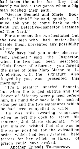 had taken the notes, for they had barely walked a few yards when a big man blocked their path. “George Bennett and Marie Gouchatt, I think?” he said, quietly. “I must ask you to come back to the bank. I'm Detective-Inspector Greames of The Yard.” For a moment the two hesitated, but the two men who had materialised beside them, prevented any possibility of escape. “We have had you under observation, Bennett,” said the Inspector, when the two had been searched. “This Power of Attorney—you forged the name of Miss Mary Marne to it. A cheque, with the signature also forged by you, was presented this morning.” “It’s a ‘plant'!” snarled Bennett, but when the forged cheque and the Power of Attorney were placed before him, his mind flew back to the masked stranger and the two signatures which lie had been compelled to write. lie was still swearing vengeance when he left the dock to serve his sentence, *but Marie Gouchatt. who saw him go. wished that she was in the same position, for the extradition order, which had been granted, held terrors for her which no threat of prison could have evoked. Another Episode To-morrow.